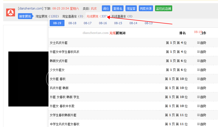 使用插件查看宝贝的无线展现词或者淘宝展现词,数值越大越好,你需要跟进数据变化,一些潜力的好款,观察他最近一周,这些曝光词是不是一直增长,如果是,优先选择,这个插件和前面是同一个,加旺旺群:2614392153领取。